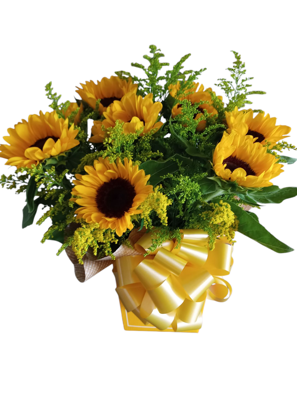 ARRANJO COM 6 GIRASSOIS E ASTROMELIAS NA CAIXINHA